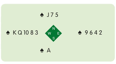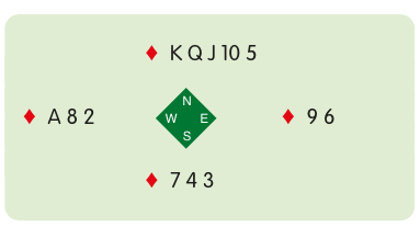 Declarer plays a diamond to the king and continues the suit to drive out the ace. East plays high-low (the nine before the six) to show an even number of diamonds, clearly two. This enables West to hold up the A until the third round. If East had three diamonds, he would play upwards and West would know to take the ace on the second round.