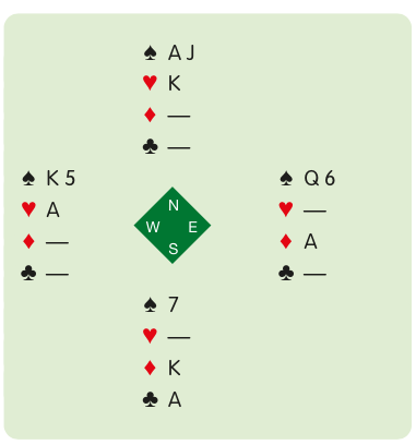 As South, declarer, you lead the ♣A. To keep the ♥A West throws a spade. After dummy throws the ♥K, East is in a similar position to his partner. To keep the ♦A East too throws a spade, leaving the ♠A-J to win the last two tricks.