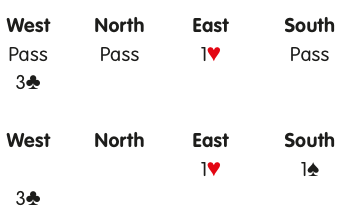 In the first auction, 3♣ cannot be a strong jump shift because West passed as dealer. In the second auction, many pairs are happy to give up on the strong jump shift after the overcall and play this as a fit-showing jump. In either auction, West might hold: