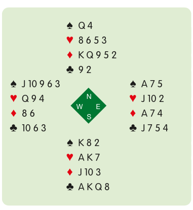 Declarer plays on diamonds and it is East’s turn to hold up. Winning the first or second diamond would allow the diamond suit to produce four tricks. Instead, East holds up the ♦A twice, taking it on the third round.