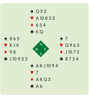 Instead, you play for a squeeze. You want to arrive at a position where only one defender is guarding both red suits. You cross to the ♥A, ruff a heart high, back to the ♠Q and ruff another heart high.