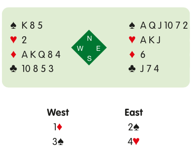 East’s 4♥ shows first- or second round control of hearts and, just as importantly, denies first- or second- round control of clubs (East would make the cheaper cue bid of 4♣ if holding a club control). This enables the players to stop safely in 4♠.