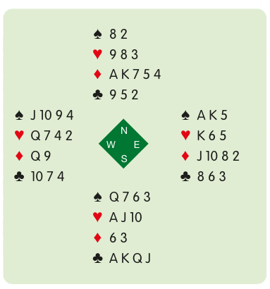As South, you play in 3NT. West leads the jack of spades and you win the third round with the queen. You have eight top tricks and chances in the red suits for more. If diamonds are 3-3, you can set up the suit by ducking a round.