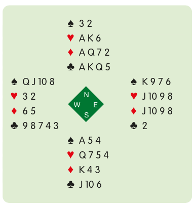 At this point six tricks will have gone and only seven cards will remain in each hand. Neither defender will be able to retain four cards in both hearts and diamonds. Ducking the opening lead ‘rectifies the count’.