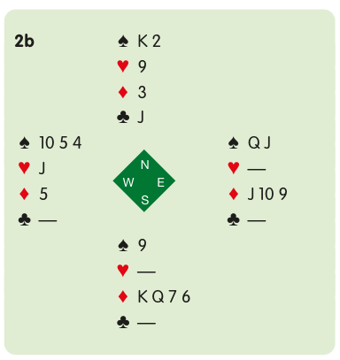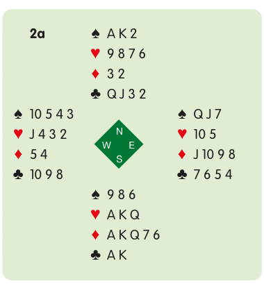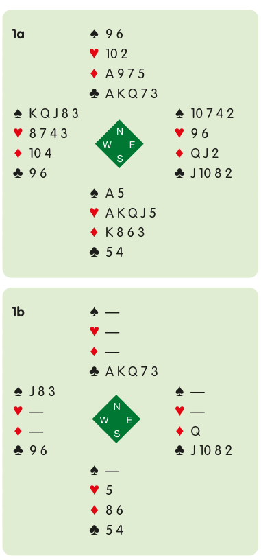You can make 6♣, 6 or 6 without problem but go for a top score by playing in 6NT. West leads the ♠K. You duck the first spade (see RECTIFYING THE COUNT) and win the continuation. You then cash the A-K and play off your hearts to reach the position in 1b). The last heart catches East in a simple squeeze, obliging him to unguard one of his minor suits.