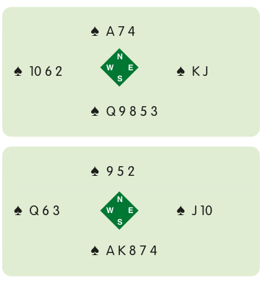 In the second, declarer cashes the ace-king. Here West might play high- low even with no desire to ruff. When declarer stops drawing trumps, East can infer that either West has no more trumps or that West’s remaining trump is a winner. West’s trump echo tells East which it is.