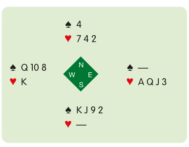 In this four-card ending, spades are trumps, the lead is in dummy and South needs three of the four tricks.
